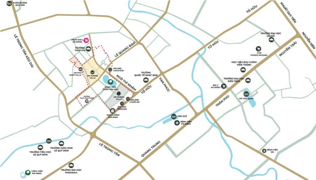Biệt thự, Shophouse phân khu An Vượng Villa – An Phú Shop Villa – An Khang Villa nằm trong khu đô thị Dương Nội, tọa lạc tại vị trí vàng nơi cửa ngõ phía Tây, vừa là trung tâm quận Hà Đông vừa là tâm điểm kết nối cực kỳ thuận tiện đến các tuyến giao thông trọng điểm như Tố Hữu, Ngô Thì Nhậm, Lê Quang Đạo kéo dài…Từ dự án dễ dàng kết nối đến hệ thông hạ tầng tiện ích dịch vụ chất lượng cao trong bán kính 3 km.