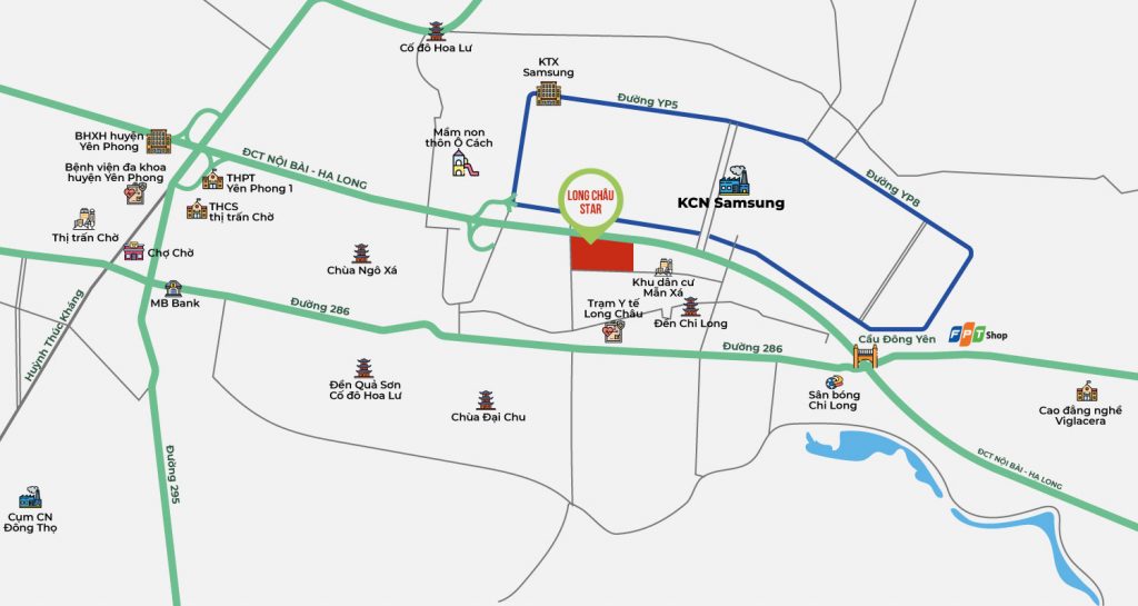 Dự án Long Châu Star (Đất nền Mẫn Xá – Yên Phong) có vị trí tọa lạc tại thôn Mẫn Xá, xã Long Châu, huyện Yên Phong, tỉnh Bắc Ninh. Dự án sở hữu vị trí chiến lược ngay QL18 (đường cao tốc Hà Nội – Hạ Long), đối diện là khu công nghiệp Samsung Yên Phong, mặt sau là tiếp giáp khu dân cư Ngô Xá, Mẫn Xá.
