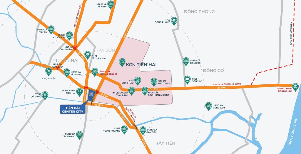 Sở hữu vị trí cực kỳ thuận lợi, nằm sát cao tốc ven biển từ Quảng Ninh tới Thanh Hóa, di chuyển dễ dàng tới Thành phố Hải Phòng (40p), sân bay quốc tế Cát Bi – Hải Phòng (55p), cảng nước sâu Lạch Huyện – Hải Phòng (60p), sân bay quốc tế Vân Đồn – Quảng Ninh (150p), cửa khẩu Móng Cái – Quảng Ninh (180p), nổi bật với các khu – cụm công nghiệp lớn như KCN Tiền Hải, cụm công nghiệp An Ninh, Tây An,… Huyện Tiền Hải đang thu hút đầu tư mạnh mẽ từ các nước Hồng Kông, Đài Loan, Hàn Quốc…